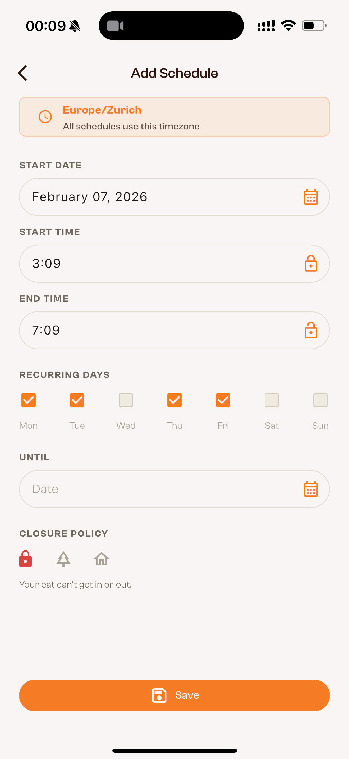 Here's an example: a lock from 3:09 to 7:09 AM, every Monday, Tuesday, Thursday, and Friday, starting February 7, 2026. The closure policy is "Closed in both Directions" — the cat can neither enter nor exit during this time.